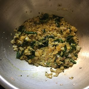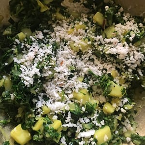 - Next, add the potatoes and saute for some time, add in the fenugreek leaves and cook until done. Add the grated coconut and mix well.