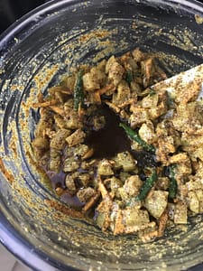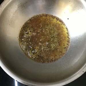 - Heat oil in a small pan, add a tsp of mustard seeds, wait till it crackles, add the asafoetida and turmeric powder. Allow it to cool completely.