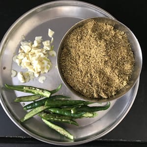 - Grind the mustard seeds to a fine powder. Fry the fenugreek seeds in a little oil and powder it.Chop garlic and slit the green chillies.