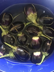 - Meanwhile slit the brinjals into four parts, just more than halfway through, so it remains as a whole with the stem intact.