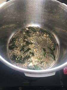 - Heat oil in a pressure cooker, add the mustard seeds, once it begins to splutter add the curry laves, ginger and garlic. Saute for a few seconds.