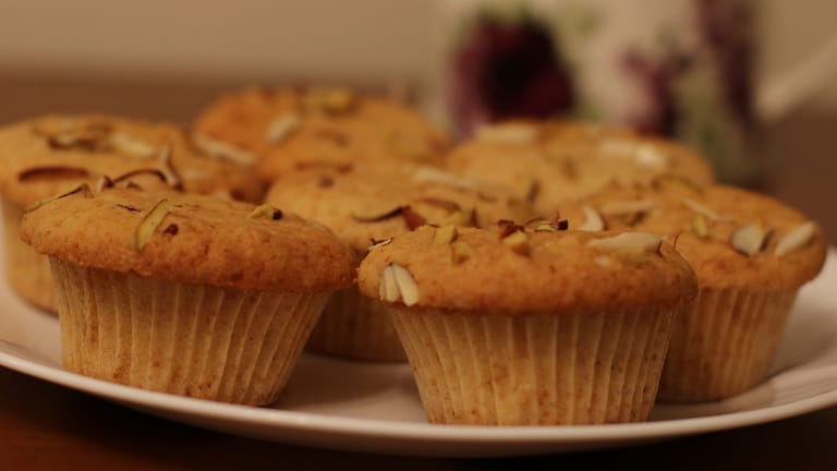 - Divide the batter into the prepared muffin tray and sprinkle the slivered nuts on top.