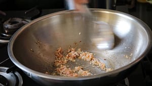 - Put the pan with the oil back on the flame. Fry the remaining chopped onions until golden brown.