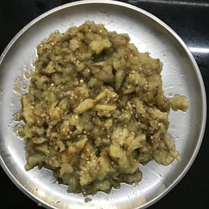Remove from fire and let it cool completely. Peel off the skin and mash the eggplant and keep aside.