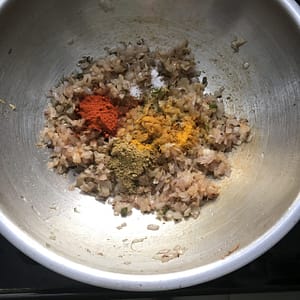 Cook on a medium flame till it becomes slightly golden in colour. Next, add in the coriander powder, turmeric powder, and the red chilly powder and salt Mix well.