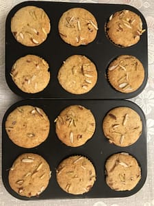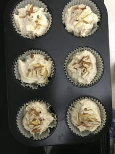 - Divide the batter into the prepared muffin tray and sprinkle the slivered nuts on top.