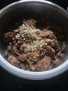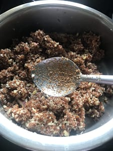 - Add the grated coconut and the jaggery into the soaked aliv. Leave it again for about half an hour. The gel of the seeds will absorb the flavour of the jaggery and the coconut.