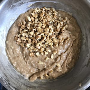 Add in the chopped walnuts. Mix gently. Dissolve the baking soda in 1 tsp of milk and combine into the batter