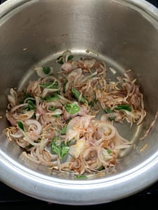 Heat oil in a pan, add the onions and curry leaves and saute over a medium heat until light golden in colour.